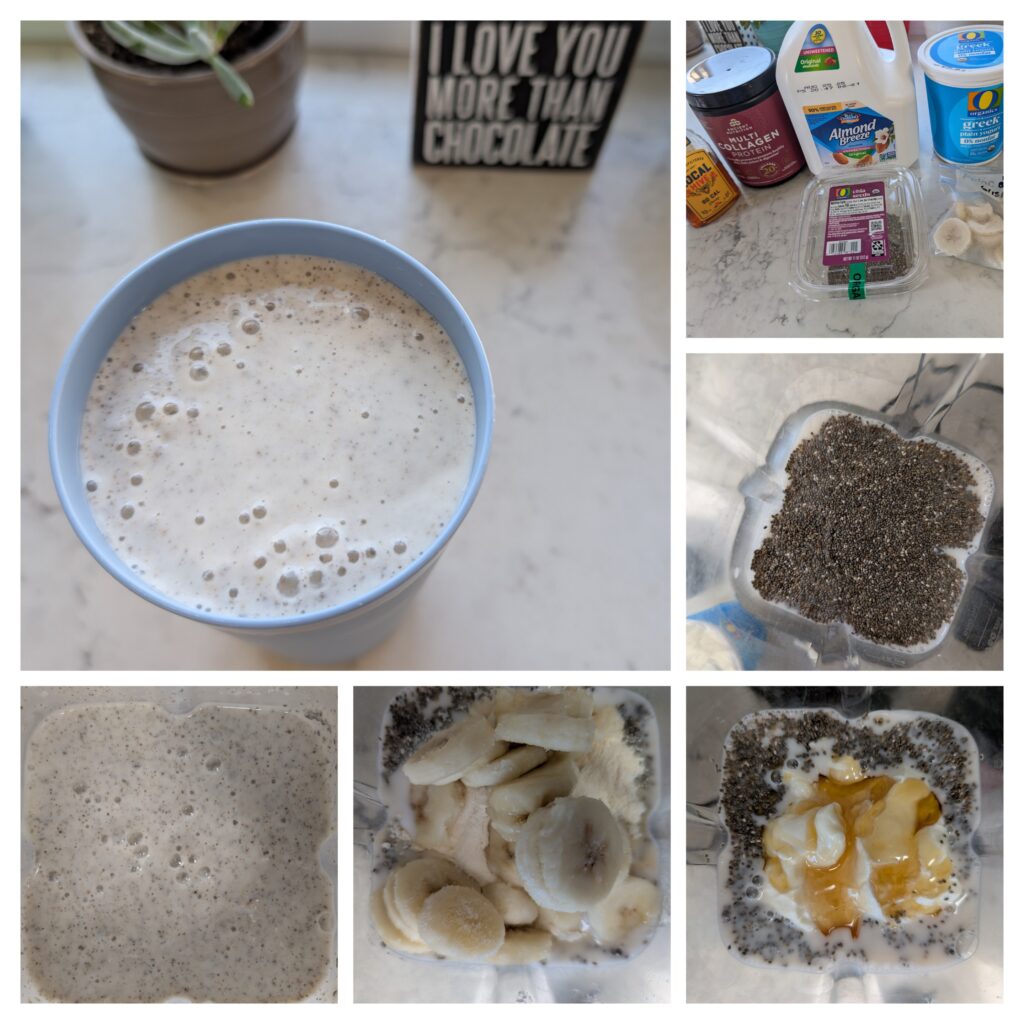 - Add to blender, in order: 1 cup unsweetened almond milk, 2 Tbsp chia seeds, 1 cup plain nonfat Greek yogurt, 2 scoops collagen protein powder, 1 Tbsp honey, and sliced 1 frozen banana.