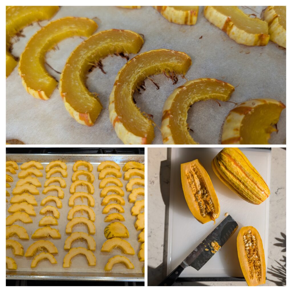 - Arrange half moons of squash in a single layer on prepared baking sheet.