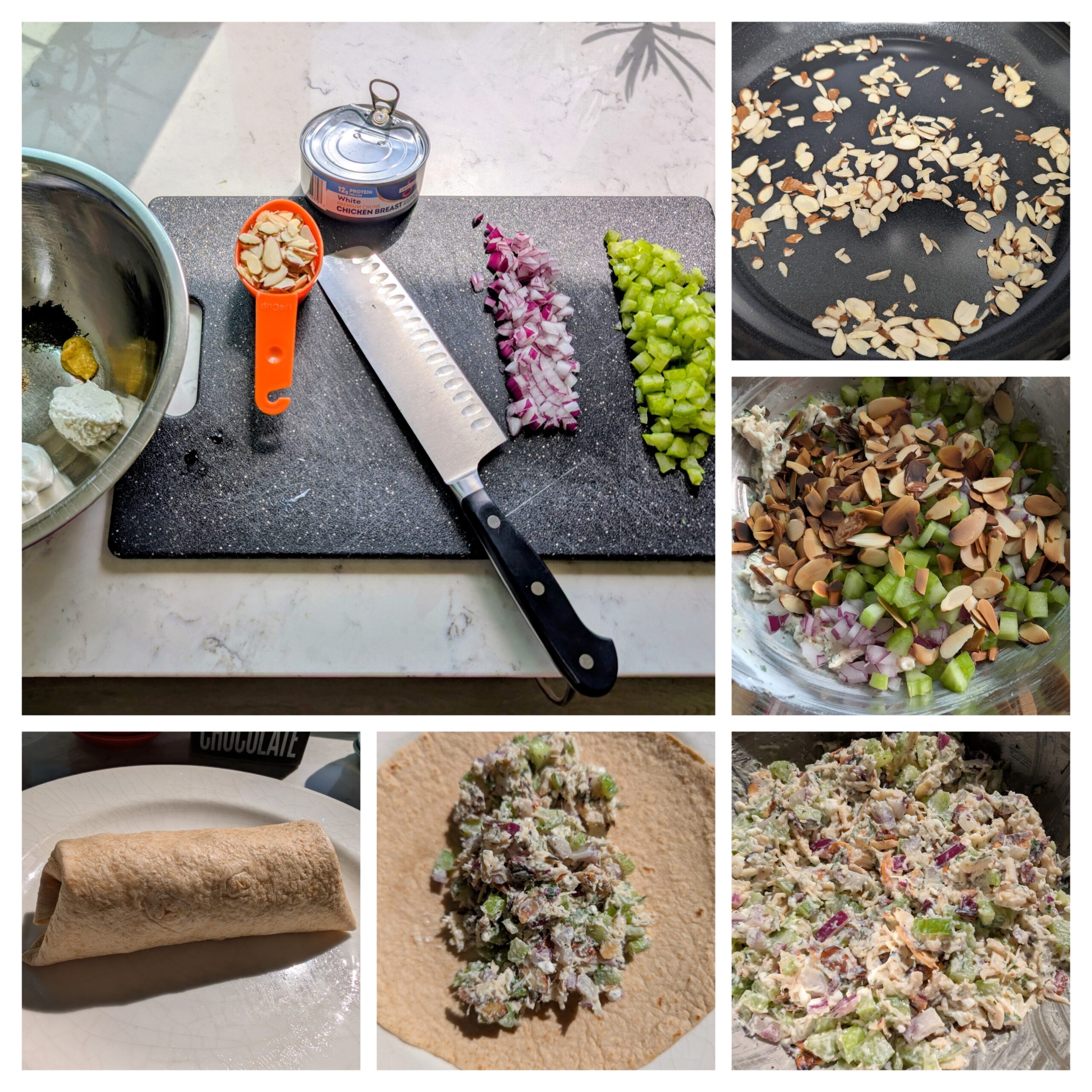 - Add 1/3 cup finely diced celery, 1/4 cup finely diced red onion, and 1/4 cup toasted sliced unsalted roasted almonds, then stir until well-coated.