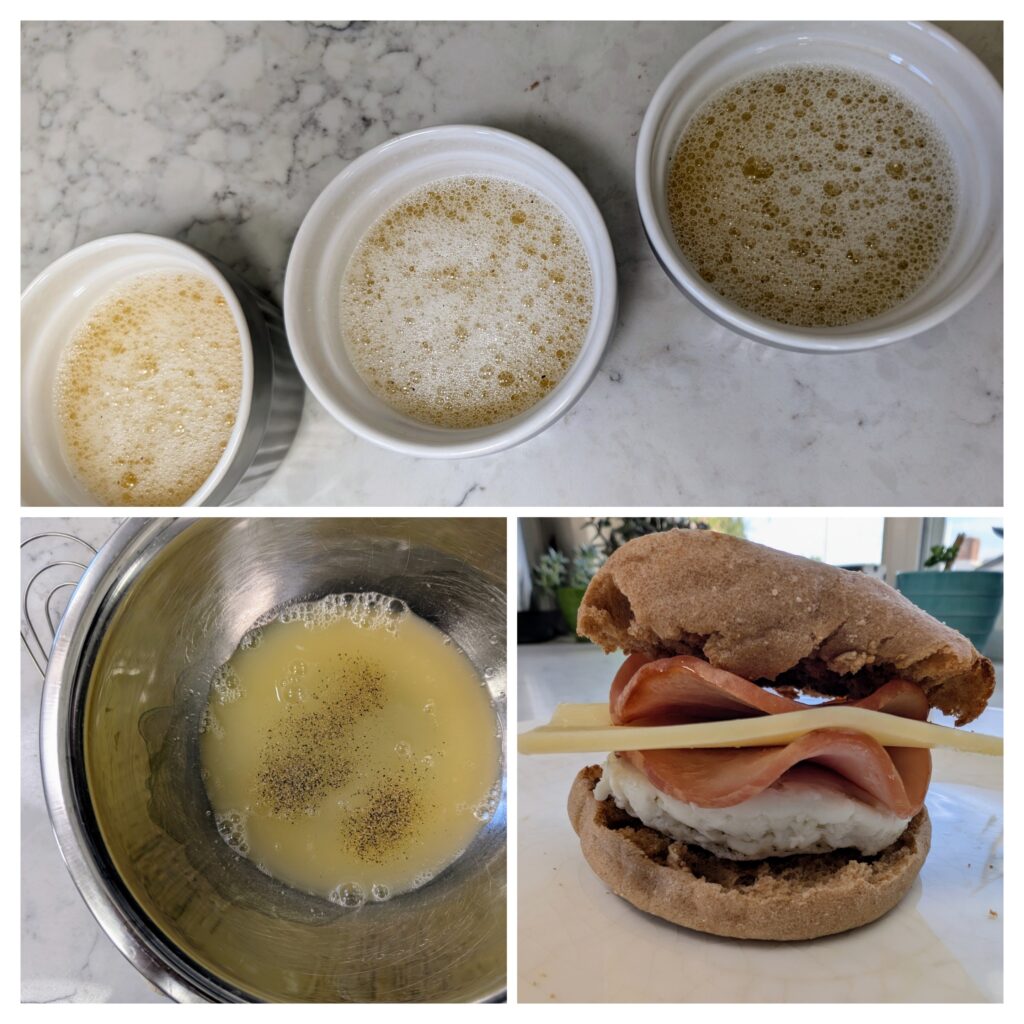 - Pour frothy egg white mixture into a microwave-safe bowl, approximately the size of the muffin – I use a 4 oz ramekin – and microwave for approximately 1 min + 20 secs.