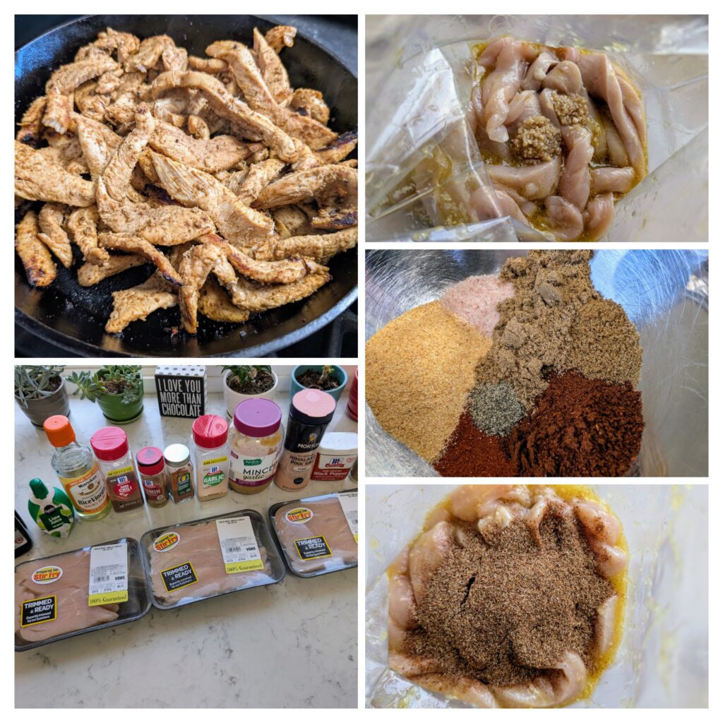 - To a gallon-size Ziplock bag (or large shallow dish with a lid/cling wrap), add 1 lb strips of thin-cut boneless, skinless chicken breast.