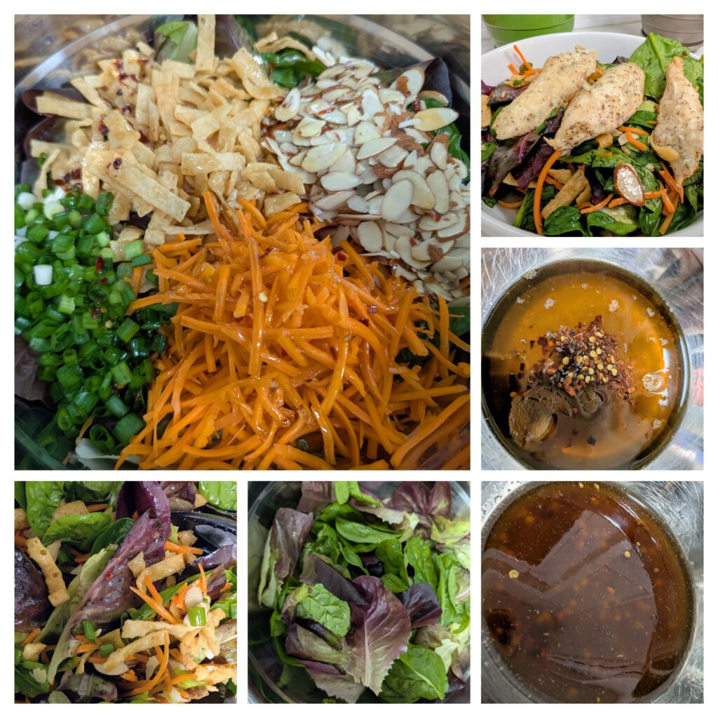 - Top with quadrants of sliced 6 green onions, 2 cups wonton strips, 1 cup shredded carrots, and 1/2 cup sliced unsalted almonds – then gently toss until all ingredients are well-coated in dressing.