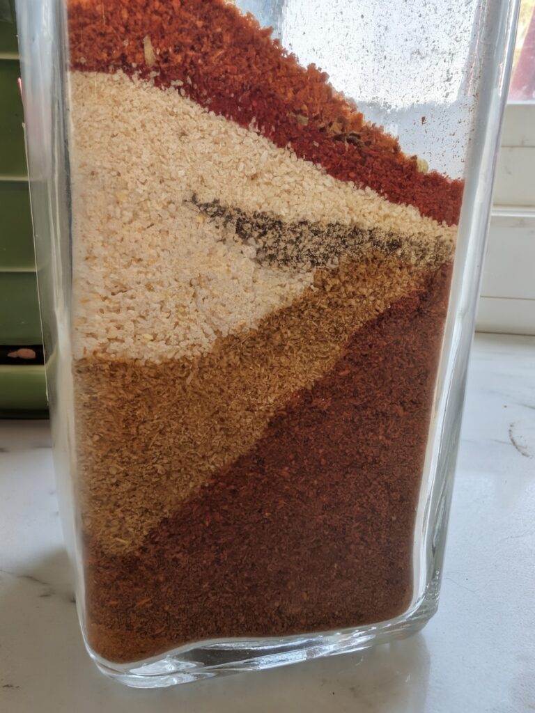 - Add all ingredients (2 Tbsp chili powder, 2 tsp cumin, 2 tsp garlic salt, 1 tsp black pepper, 1 tsp onion powder, 1 tsp paprika, 1/2 tsp oregano, and 1/4 tsp cayenne) together in an airtight spice jar.